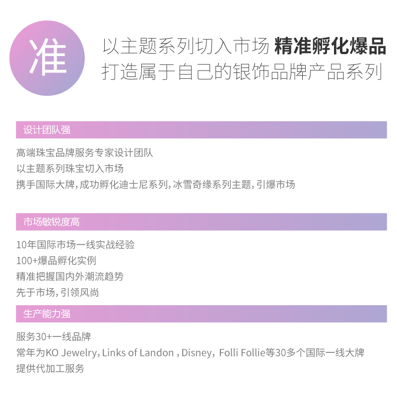 变色龙不仅是优秀的银饰加工厂,更是品牌银饰孵化器,我们能够解决的不仅是简单的设计制作问题,而是从源头到终端的一站式低成本高效地解决银饰品类的4大关键问题: