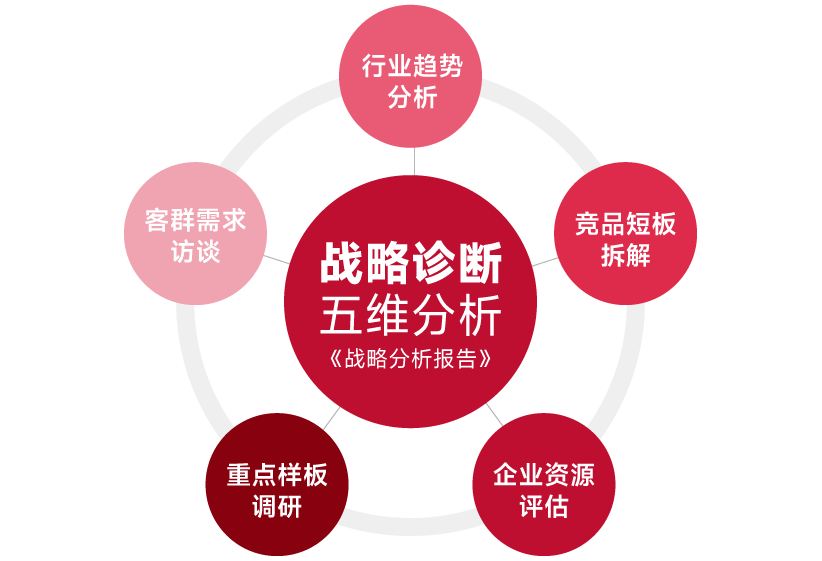战略诊断五维分析以全景调研为基础,通过五大核心维度构建科学决策依据,输出《战略分析报告》,为品牌战略落地提供精准指引: