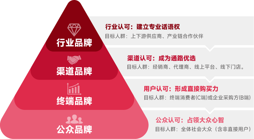 尖刀营销“品牌认知层级”突破传统“泛品牌”模糊定位,构建“行业 - 渠道 - 终端 - 公众 ”四层递进式品牌成长路径,清晰界定各层级认知逻辑、传播对象与影响力边界,典型案例参考:行业品牌(如利乐)、渠道品牌(如佛山照明)、终端品牌(如三诺血糖仪)、公众品牌(如可口可乐)。